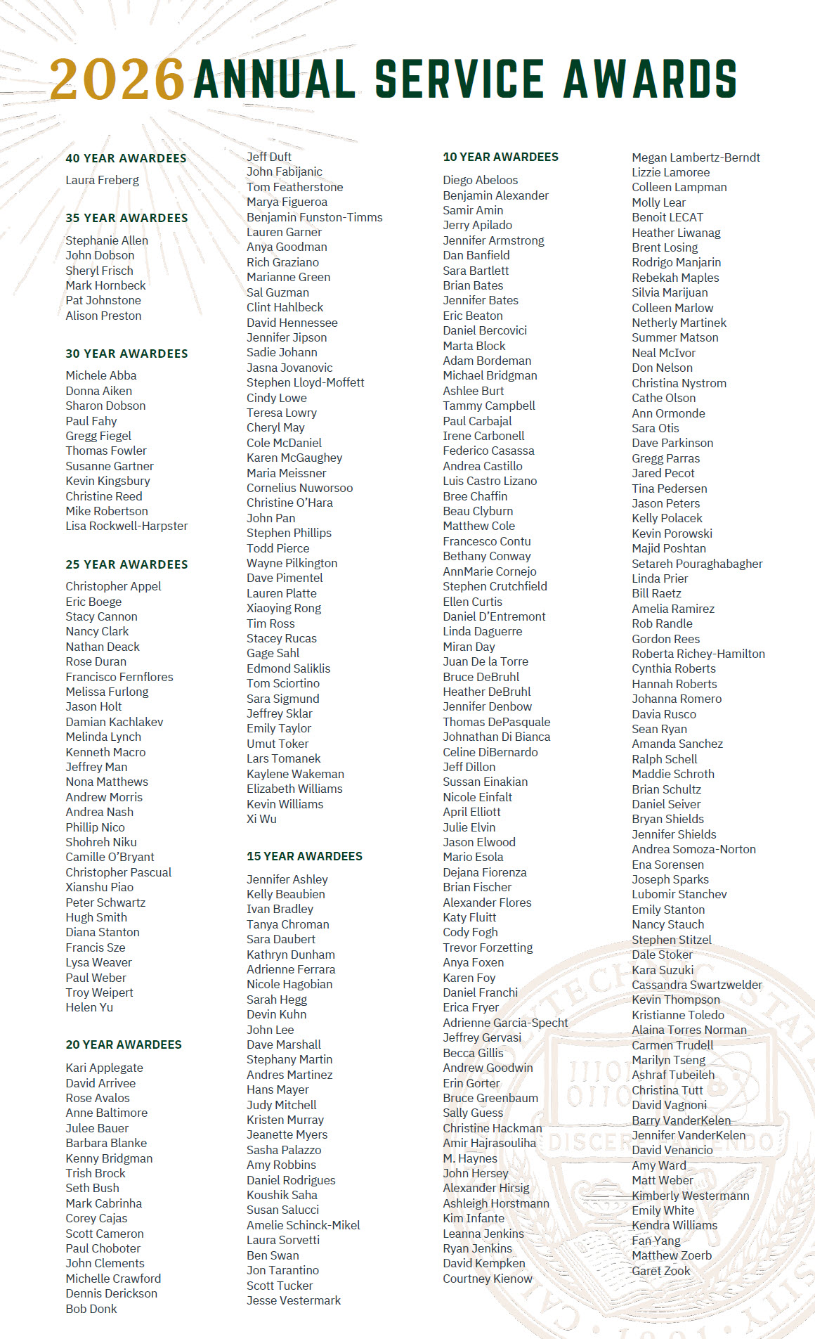The following individuals reached a milestone anniversary during calendar year 2025 and will be honored during a ceremony on April 1, 2026.